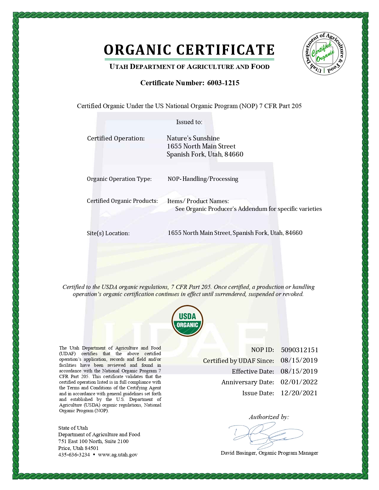 - USDA: Eliberează pentru Nature's Sunshine certificate de liberă vânzare (Free Sale). Aceste certificate sunt emise pentru fiecare produs în parte și sunt necesare pentru înregistrarea produselor pe alte piețe.