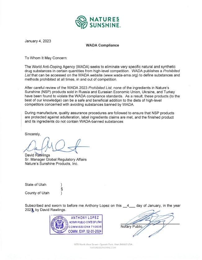 - WADA (World Anti-Doping Agency): Certificatul WADA confirmă absența componentelor interzise în produse și permite utilizarea acestora de către sportivi.